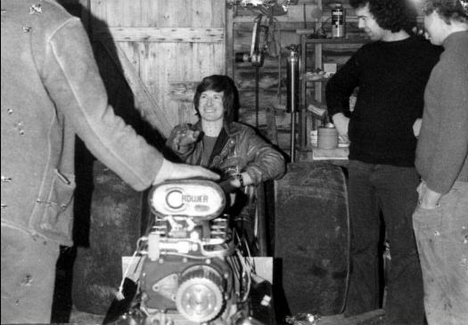 Dave Stone during a visit to Close Farm Nr Tetbury to see how the construction, by Roland Pratt, of the new 'Tee Rat II' chassis is progressing. Left is Gerald Haines, seated is Dave, to his right, Mike Fisher then Roland Pratt. Photo by David Forward, 1975ish.